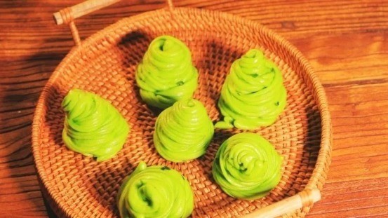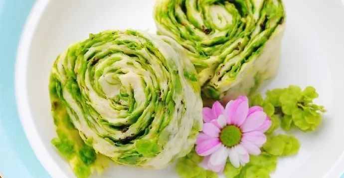 r做法:①草头榨汁和面(面500克、水270-280克),擀成长方形面片。先抹油接着撒面粉,加盐和葱花调味。②折成三折,然后切条,抻长后绕着手指卷成为花卷。上蒸锅大火蒸15分钟即可。
